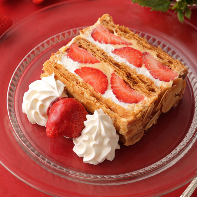 サクサクのパイ生地で、苺とクレーム・シャンティー、ディプロマットクリームを重ね合わせることで生まれる