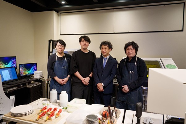 左から、シェフ藤原俊城氏、総合数理学部4年生 吉本健義さん、総合数理学部 宮下芳明 教授、シェフ深作直歳氏。
