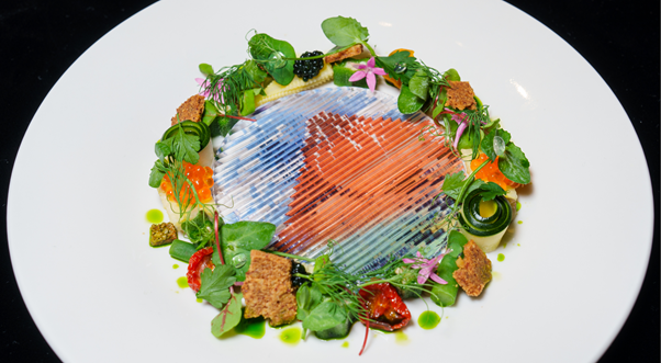 今回「見る角度によって見え方が変わる料理」として提供を開始したこのサラダは、「ポーセラーツ」という陶磁器に絵柄を転写する技術を用いてお皿にレンチキュラ画像を印刷し、その上に寒天とだしを使って作製した可食レンチキュラレンズを載せています。レンチキュラレンズの光学特性によって、見る角度によって「富嶽三十六景」の「凱風快晴」と「神奈川沖浪裏」へと絵柄が変化します。
