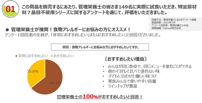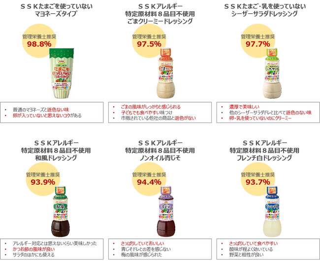 エスエスケイフーズ株式会社(本社:静岡市葵区、代表取締役社長 中村 悟)は、全国の管理栄養士を対象に 「アレルギー特定原材料7品目不使用シリーズ」6品に関する調査を外部機関で実施しました。管理栄養士149名全員の方から、本シリーズを食物アレルギーにお悩みの方におすすめしたいという回答を得ました。