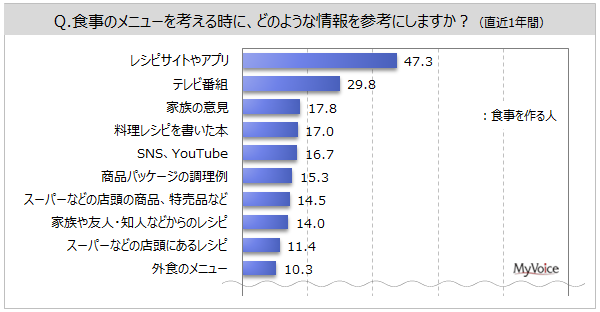 ■食事のメニューを考える時、直近1年間に参考にした情報は、「レシピサイトやアプリ」が食事を作る人の5割弱、「テレビ番組」が3割、「家族の意見」「料理レシピを書いた本」「SNS、YouTube」が各2割弱