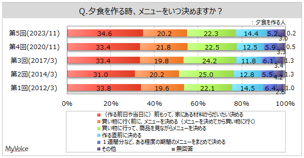 夕食を作る人がメニューを決めるタイミングは、「前もって、家にある材料からだいたい決める」が34.6%、「買い物に行って、商品を見ながらメニューを決める」が22.3%、「買い物に行く前に、メニューを決める」が20.2%です。女性10~30代では、「作る直前に決める」がやや高くなっています。