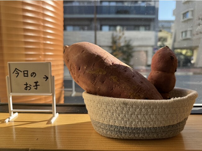 来店すると待ち受けるのは、木を基調とした温もりの溢れる店内。玄関横の小窓には「今日のお芋」と称して店長おすすめのお芋が置かれています。さつまいもの焼けるいい香りが鼻をかすめ、気分はわくわく。