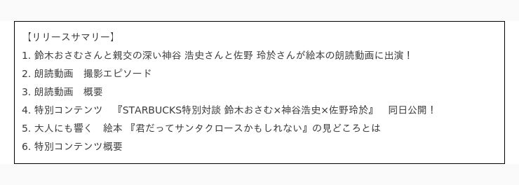 スターバックスがホリデーシーズンに実施している「Be a Santaドネーションプラグラム」。ビバレッジの売上の一部を、スターバックスのフードなどをセットにしたホリデーギフトとして地域のこども食堂の子どもたちへ寄付する活動です。今年は、本プロジェクトとスターバックスの想いに共感してくださった放送作家・鈴木 おさむさんが、ご自身の引退前最後の絵本作品として、「君だってサンタクロースかもしれない」を書き下ろしてくださいました。2023年12月11日(月)からは、鈴木さんと親交がある声優の神谷 浩史さんとGENERATIONSの佐野 玲於さんそれぞれが鈴木さんの手がけた絵本を朗読する動画を公開します。動画では絵本の全編をお二人それぞれが朗読。絵本の世界観を各々の想いを込めて表現してくれました。