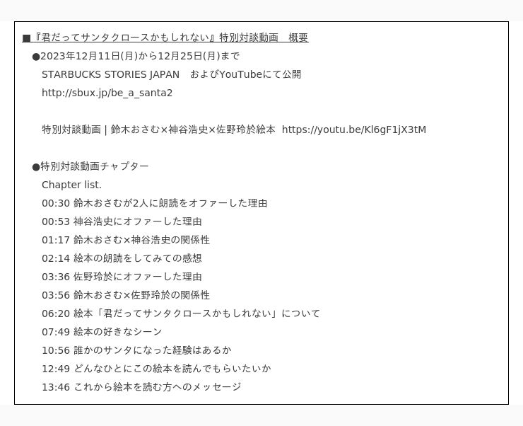 スターバックス コーヒー ジャパン 株式会社[本社所在地:東京都品川区、代表取締役最高経営責任者(CEO):水口 貴文]は、放送作家・鈴木 おさむさんによる書き下ろし絵本『君だってサンタクロースかもしれない』を2023年11月15日(水)より展開。今回、絵本の制作を記念した特別コンテンツとして、鈴木おさむさんと親交のある声優の神谷 浩史さんとGENERATIONSの佐野 玲於さんにご出演いただいた朗読動画を2023年12月11日(月)より公式サイトにて公開いたします。お三方が揃った初のスリーショットで絵本制作の裏側や、読者への想いを語った『STARBUCKS特別対談動画』も同日に公開いたします。
