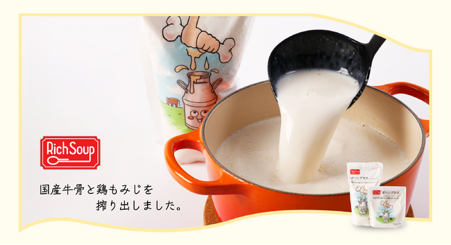 「Rich Soup」は、骨を煮出して作る出汁スープ「ボーンブロス」の国内新ブランドです。国産の牛骨と鶏もみじを圧力寸胴鍋で搾り出すように炊き上げることで、一般的なボーンブロスに比べ濃厚で真っ白なスープに仕上がっております。
