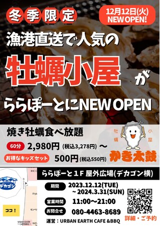 開放感あふれるららぽーとの屋外広場に牡蠣食べ放題の牡蠣小屋がオープンしました!