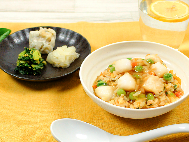 イタヤ貝の小柱を使用して、オイスターソースを隠し味に使用した鶏ガラスープの餡をかけた、あんかけ炒飯です。グリンピースをトッピングに使用しました。餡とご飯をよく絡めて、お召し上がりください。