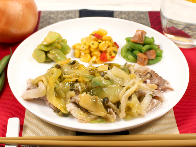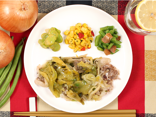 薄切りの牛バラ肉に、玉葱、しめじとザーサイを添えて、高菜漬けのソースをかけました。中国漬物の豊かな風味をお楽しみください。