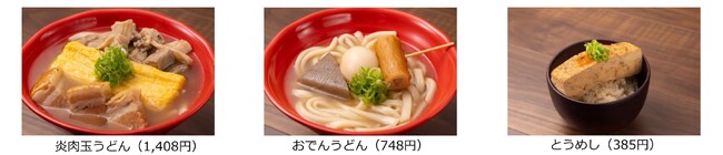 目玉はメニューは「炎(ほむら)肉玉うどん」1,408円)で、牛すじ、ブランド豚「栗豚」の角煮、手作り出汁巻き玉子(卵 4個分)が乗ったボリューム満点のうどんです。 こんにゃく、玉子、ごぼう入りちくわが乗った「おでんうどん」(748円)はその名の通り串に刺さったおでんがそのままうどんに乗せられ、見た目にも面白いメニューとなっています。ご飯物も充実させ、おでん出汁で炊いたご飯に、焼き豆腐を乗せた「とうめし」(385円)も豆腐の厚みに驚くこと間違いなし。日本酒や焼酎との相性も抜群です。