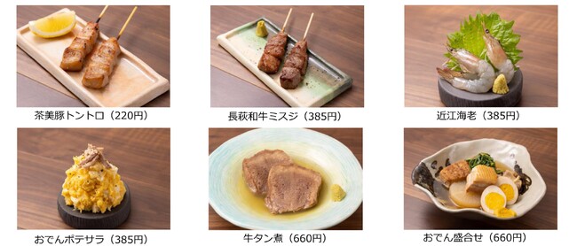 「シン・コバチ炎-串とおでん-」ではおでんと串焼きが主役です。お昼に提供しているおでんはそのままに、串焼きをおすすめします。 串焼きは「茶美豚」「長萩(ちょうしゅう)和牛」「阿波尾鶏」「近江海老」などブランド食材がずらり。贅沢でありながら、立ち呑み業態にすることで、相場の 7割~8割程度に価格を抑えました。