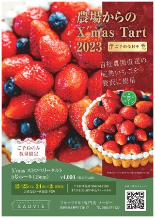 知多市にあるフルーツタルトソービー本店では、農場直送の完熟いちごを贅沢に使った『農場からのX'masタルト2023』の予約を受け付けています。
