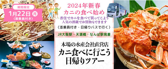 株式会社フォーティーズ(本社:大阪市鶴見区、代表取締役 岡武史)は、おひとり様¥15,800- 1月22日(月) 【兵庫県・香住】〈大阪駅・天満橋・なんば発着・添乗員付き〉香住の本場の水産会社直営店 カニ食べに行こう日帰りバスツアーのオンライン販売を開始しました。ツアー詳細はこちら https://4trip.jp/dome/plan/18228上記商品以外のお得な情報をお届けする公式LINE追加はこちらhttps://lin.ee/JAOTwl0