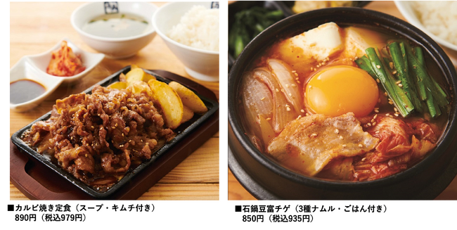 メニューは、熱々の鉄板焼肉で提供する焼肉定食を始め、ボリュームのある丼や冷麺、チゲなど焼肉屋さながらのバリエーションを用意しています。カルビ焼き定食 890円(税込979円)とお財布にも優しく、定食や焼肉丼はごはんが大盛り無料なのでお腹いっぱい食べられます。定食はスープとキムチ、焼肉丼はスープが付いてきます。
