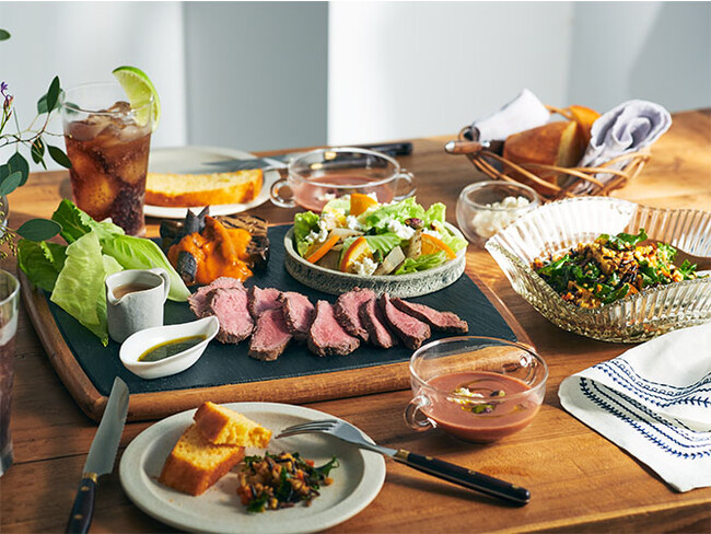 アメリカといえば、お肉です。メインのウワミスジのステーキは、爽やかなチュミチュリソースか、王道グレービーソースで。多様な価値観を再現したサラダ、伝統的なコーンブレッド、季節のイチゴを味わう冷製スープなど。スローフードの精神がつまった5品です。