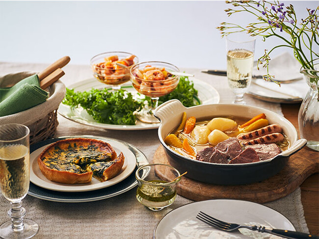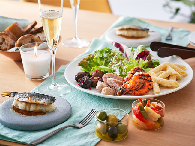 「アペロ」とは、ディナーの前に軽くお酒を楽しむフランスの習慣のこと。そんなひと時にふさわしい前菜を揃えました。いわしポテトは、小ぶりの可愛らしい丸皿に。3種オリーブのマリネなどは、美しいガラスの器に。5種の前菜は、初回便のフラットプレートがよく似合います。