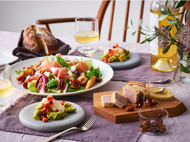 パーティを華やかに彩るセットです。パテ・ド・カンパーニュは、ウッドプレートひとつで、レストランのような佇まいに。アボカドとポテトのサラダは、二回便のシックな丸皿を。コクのある生ハム「ハモン・セラーノ」を使ったサラダは、初回便のプレートに飾って、団らんの華に。