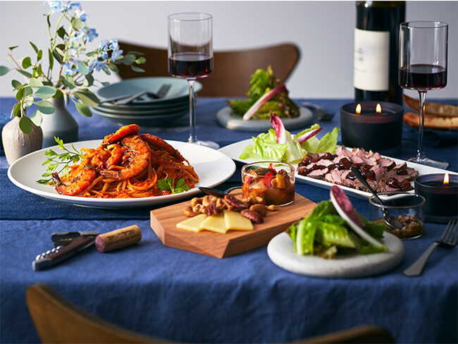 特別な食卓には、やっぱり特別なひと皿を。合鴨のローストは長角プレートで豪華さを。ソースまで、魅力的に輝きます。ソフトシェルシュリンプをまるごと味わうパスタは、初回便のフラットプレートがぴったり。すべての料理とお皿たちが、大切なひと時を祝福してくれます。