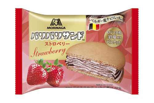 このたび発売する「パリパリサンド<ストロベリー>」は、「パリパリサンド」としては約2年ぶりの期間限定フレーバーの発売となります。苺果汁をクリーム中に約10%使用し、香り華やかな苺アイスに仕立て、パリパリチョコとの相性も抜群です。また、アイス全体の甘味を引き立て、後キレよく味わえるように、ビスケットにロレーヌ産岩塩を使用しています。苺フレーバーの需要が高まる季節に、季節感のある味わいの商品を発売することで、お客様に笑顔をお届けしてまいります。