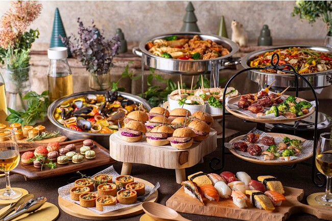 握り寿司、ミニバーガー、キッシュ、焼きそばなど、和洋折衷の親しみやすいメニューで構成!