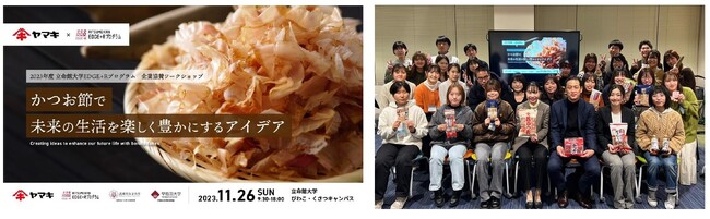 ヤマキ株式会社(本社:愛媛県伊予市 代表取締役社長:城戸善浩、以下 ヤマキ)は、11月24日「鰹節の日」に際し、立命館大学・武庫川女子大学本田研究室・早稲田大学野中研究室と共同で、2023年11月26日(日)にワークショップを開催しました。このワークショップは、イノベーション創出人材の育成を目的とした立命館大学の「EDGE+Rプログラム」の一環として実施したものです。当日は、25名の学生が立命館大学びわこ・くさつキャンパスの会場に集まり、調理科学やシステムデザインの観点から、ヤマキが掲げる3つのCSV「体の健康」「地球の健康」「心の健康」を実現し、SDGs貢献にも繋がるかつお節を活用した新たなアイデアの創出を行いました。