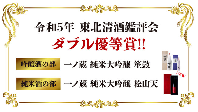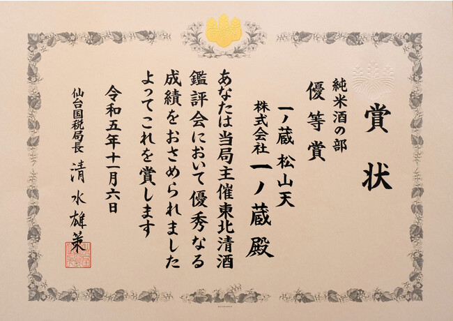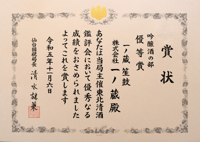 11月10日仙台国税局は、2023年東北清酒鑑評会※1の結果を公表し、一ノ蔵本社蔵の「一ノ蔵 笙鼓(しょうこ)純米大吟醸」が吟醸酒の部、「一ノ蔵 松山天(しょうざんてん)」が純米酒の部で優等賞を受賞しました。