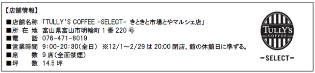 タリーズコーヒージャパン株式会社(本社:東京都新宿区、代表取締役社長:小林 義雄)は、スペシャルティコーヒーを気軽に体験できるコンセプト店舗『TULLY’S COFFEE -SELECT-』を、富山県にオープンします。