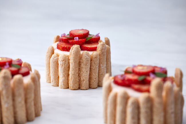 華やかなビジュアルのフランス伝統菓子「シャルロット」も、バレンタインスイーツとしておすすめです。バニラクリームの中には、苺のシロップを塗ったスポンジとストロベリージャムをひそませ、まわりにレディーフィンガースポンジを。みずみずしい苺をあしらい、ナチュラル感を生かしたビジュアルも好評です。