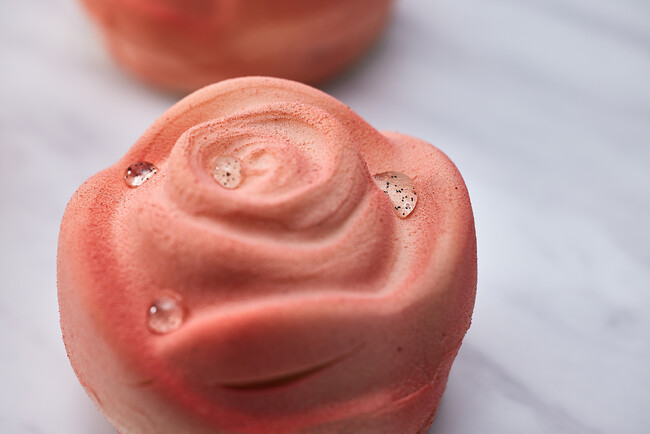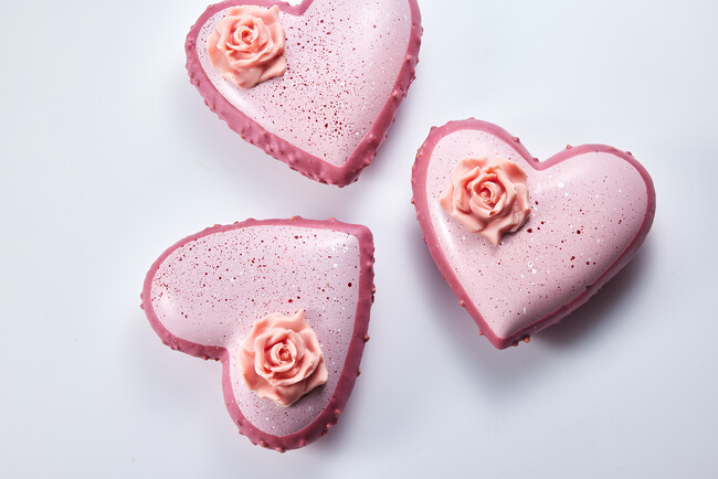 愛を伝えるバラのモチーフをほのかなピンクに染め、キュートに表現した新作スイーツ。ローズティークリームに、ラズベリージャムとヴィエノワスポンジをあわせ、ジャスミンティームースでつつんで。花々の香りにヘーゼルナッツクランブルの食感もプラスしつつ、甘味と酸味を絶妙なバランスで仕上げました。
