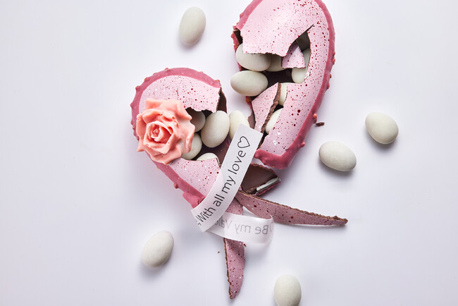 毎年好評のハートシェイプチョコレートを、今年は優しいピンクカラーでご用意します。木製ミニハンマーで割るアクションとともに、中から出てくるアーモンドドラジェもあわせてお楽しみください。ご希望によりメッセージを入れ、胸が高鳴るサプライズを演出することも。