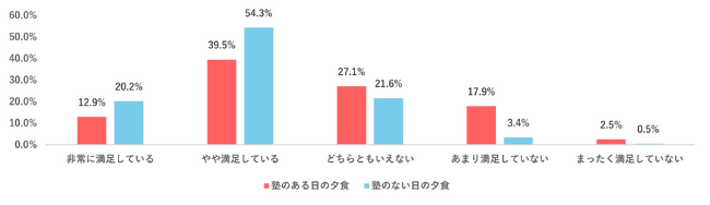 子どもの軽食や夕食に対して、塾がある日とない日でどの程度満足しているか質問したところ、上図の通り、塾がある日は、軽食、夕食ともに比較的保護者の満足度が低いことがわかりました。