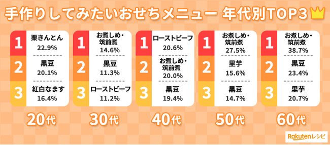 年代別でみると、すべての年代でトップ3までに入ったメニューは「黒豆」となり、年代を問わず手作りしてみたいメニューということがわかりました。