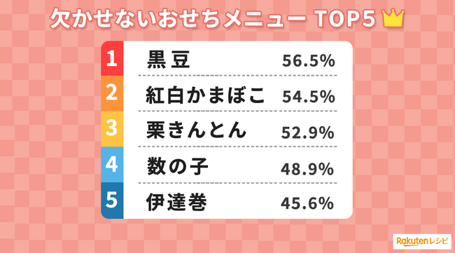 おせちで欠かせないメニューの人気No.1は「黒豆」で56.5%。「紅白かまぼこ」「栗きんとん」も5割と僅差で続く