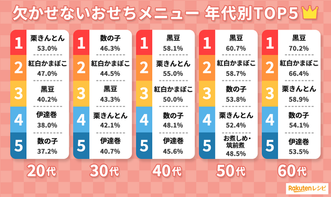 年代別でみると、すべての年代でトップ5までに入ったメニューは「黒豆」「紅白かまぼこ」「数の子」で、年代を問わず人気があることがわかりました。