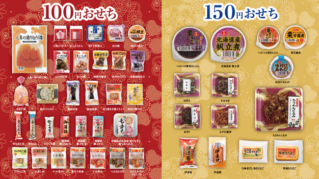 「100円おせち」は1品100円(税込108円)で好きなものを必要な分だけ買える手頃さに多くのお客様からご支持いただき、2012年の販売開始から累計約1,500万食を販売した人気商品です。おせちの定番である蒲鉾、黒豆、昆布巻等が使い切りサイズで揃うと支持されています。今年は新たに150円の価格帯も登場北海道産帆立煮など高付加価値商品も展開します。