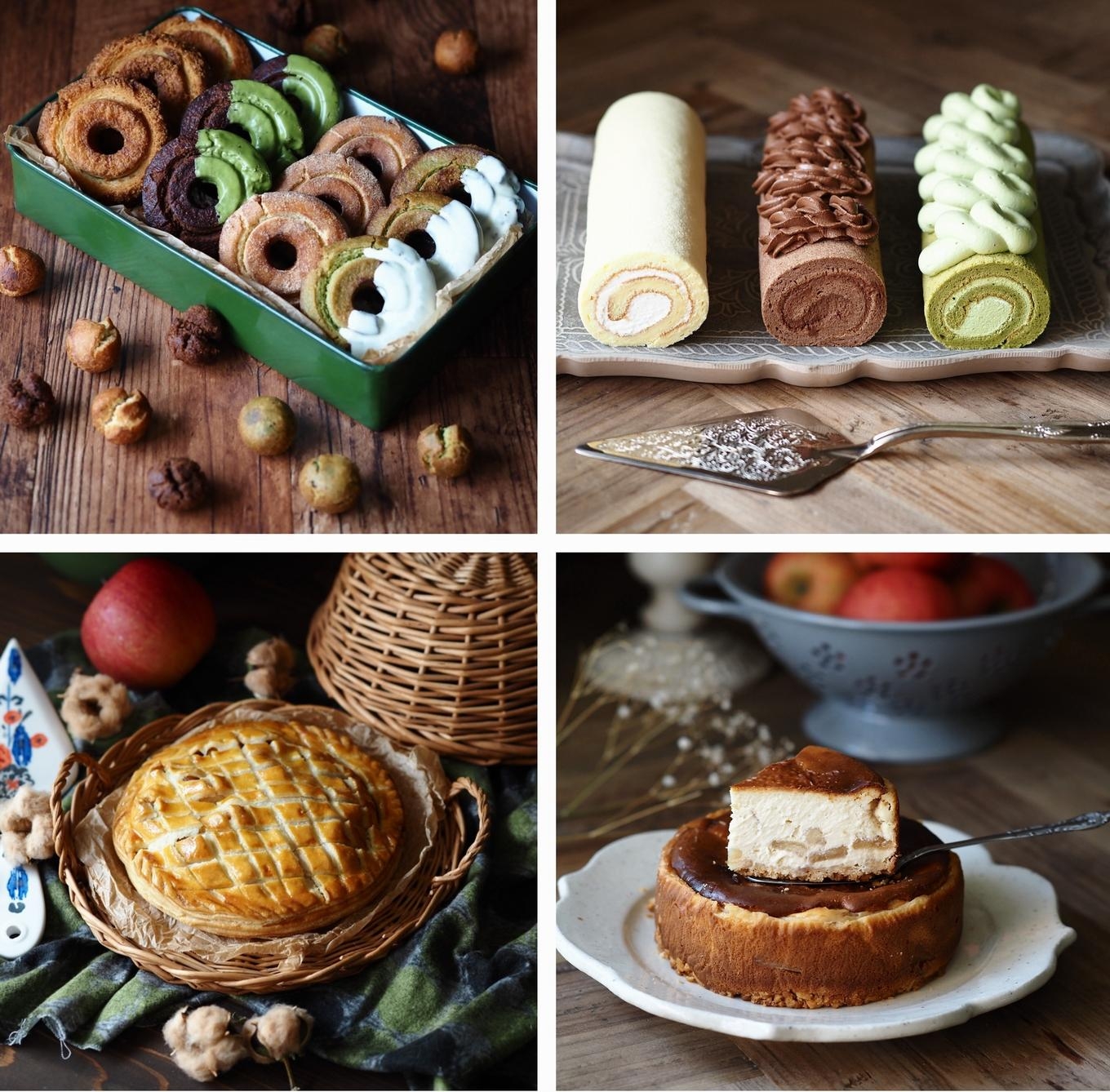 (左上から時計回りに)おなつさんの十八番レシピ「オールドファッションドーナツ」。フレーバーはもちろん、プレーン、チョコ、抹茶の3色展開。「ロールケーキ」もチョコと抹茶で3種類。トップにもクリームを絞って、ダブルリッチな仕上がりにしました。「シナモンアップルチーズケーキ」はベイクドチーズケーキ、黒糖ラムレーズンのチーズケーキの3種展開のひとつ。「アップルパイ」は編み込まずに格子模様をつけるだけで本格的な雰囲気に。