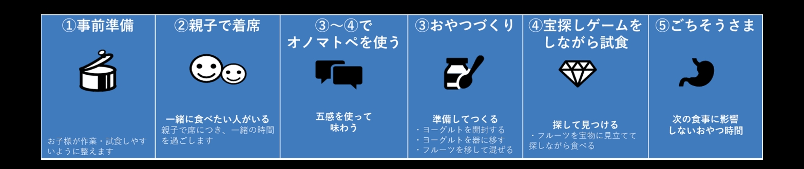 親がオノマトペを使った声掛けをしながら、子どもが主体的にヨーグルトのおやつを作り喫食するという簡単な方法が、親子のコミュニケーションの質向上に寄与することが示唆されました。