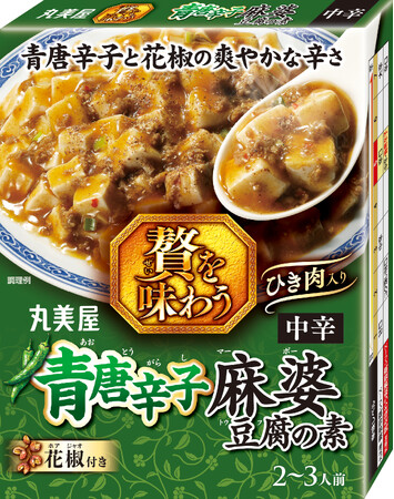 丸美屋食品工業株式会社(本社:東京都杉並区、社長:阿部豊太郎)は、本格派の麻婆豆腐が楽しめる、「贅を味わう」シリーズより、爽やかな辛味が特徴の「贅を味わう 青唐辛子麻婆豆腐の素」を2024年1月18日(木)に新発売いたします。また、「贅を味わう 麻婆豆腐の素<中辛>」、「贅を味わう 麻婆豆腐の素<辛口>」、「贅を味わう 麻婆豆腐の素<コク深い甘口>」を2024年1月にリニューアル発売いたします。 これまでにない本格麻婆豆腐の提案で、更なる市場の活性化を図ります。