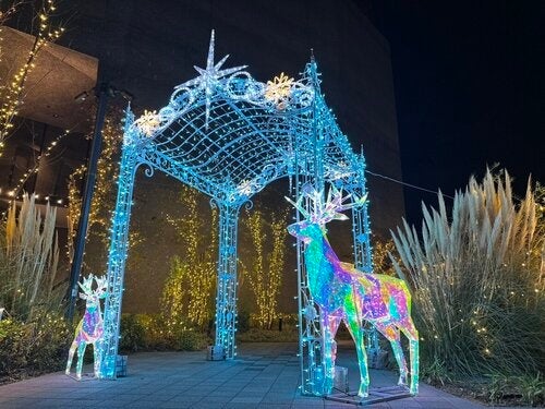 神戸ポートミュージアムのモニュメントや、虹色に光り輝くトナカイ、可愛いリース型のオブジェなどの前で写真撮影が楽しめるほか、小道を華やかに飾る約4万個のLEDの光が優しく包み込みます。ぜひこの機会にお楽しみください。