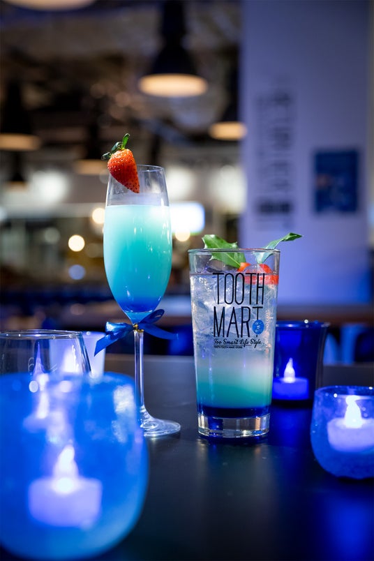 トゥースマートフードホールのシンボルである、中央バーカウンターの上にある幻想的な巨大水槽のブルーを中心に、ブルーキャンドルナイトや青いカクテルを愉しむブルーBarで、フードホール内をブルーに彩ります。