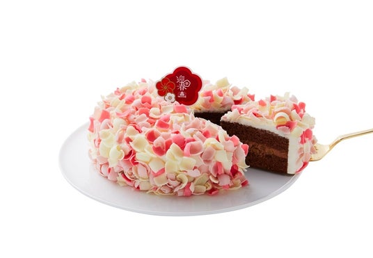 チョコレートスポンジケーキで、ウォールナッツ入りのチョコレートクリームをサンドしました。赤、ピンク、ホワイトのチョコレートコポで仕立てた、新たな年の訪れを祝う、華やかなチョコレートケーキです。