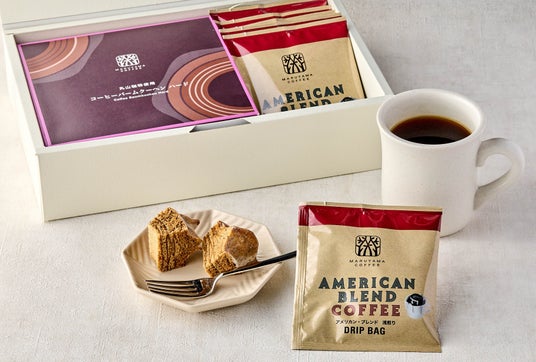 「アメリカン・ブレンド 浅煎り」をギフトセットでもご用意しました。お気軽に楽しんでいただけるドリップバッグやコーヒーバッグと「丸山珈琲オリジナル コーヒーバームクーヘン ハード」(ホールタイプ)とセットでお届けします。