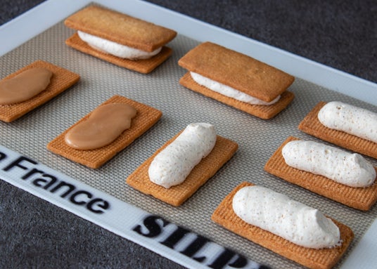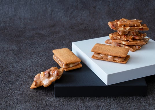 少し粗めに刻んだアーモンドを練り込んだハードクラックバタースカッチを、しっかりと焼き込んだバターサブレで挟んだオリジナルのレシピ。バタースカッチとサブレの脆性(もろさ)を調整することで、サクサクでカリカリの食感を実現しました。バターの持つ香りのポテンシャルを100%引き出し、バタースカッチの焦がしバターの香りと、アーモンドのロースト感、バターリッチなサブレの香りが、贅沢なティータイムを演出します。