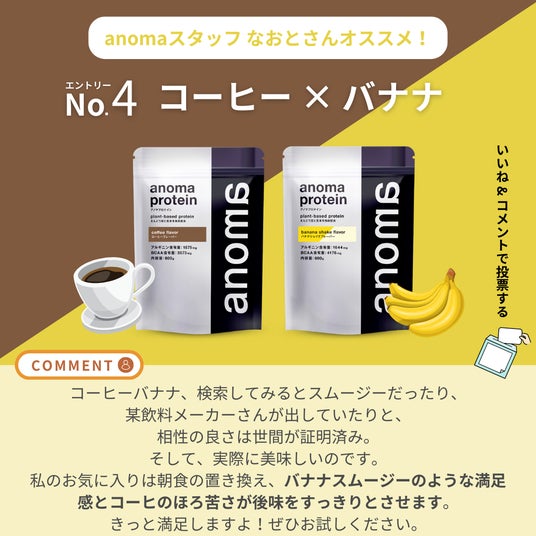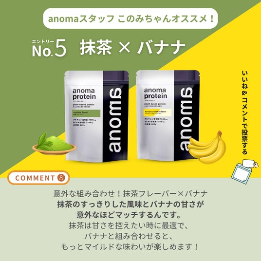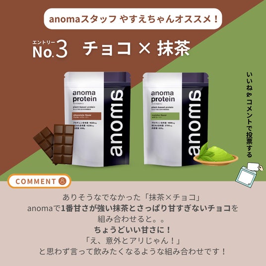 anomaスタッフがお勧めするフレーバー×フレーバーの組み合わせの中から、人気No.1を決める投票キャンペーンです。現在販売する、抹茶、チョコレート、キャラメルアーモンド、マンゴーミックス、コーヒー、バナナシェイク、ほうじ茶の8フレーバーのうち、スタッフが日常的に引用するおすすめ2つを混ぜ合わせた下記のメニューをInstagramで展開します。投票いただいた方の中から、3名様に特別ギフトをプレゼントいたします。