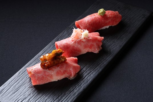 当店ではA5和牛肉寿司、蟹肉寿司、鰻肉寿司の3貫がのった肉寿司を