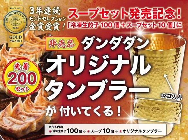 セット内容:冷凍生餃子100個、スープ10個(個包装)、ダンダダンオリジナル金色のタンブラー(非売品)