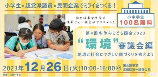 株式会社ミナシア(本社:東京都千代田区、代表取締役:下嶋一義)は、小学生と超党派議員、民間企業でミライをつくるイベント「冬休みこども国会2023~環境編~」(主催:こども国会実行委員会、運営:CHEERS株式会社)に協賛します。本イベントは、2023年12月26日(火)に国会議事堂および衆議院第一議員会館にて開催され、100名の小学生が無料招待されます。