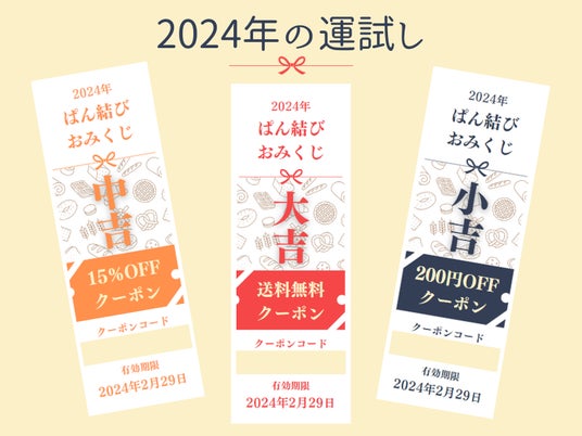 - ぱん結びおみくじが入っていたらラッキー♪「ぱん結び」で使える大吉(送料無料クーポン)・中吉(15%OFFクーポン)・小吉(200円OFFクーポン)の3種類のおみくじをご用意。2024年の運試しにどうぞ。