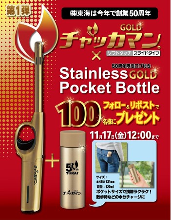 第1弾は【チャッカマンゴールド×1本】と【ステンレスポケットボトルゴールド×1個】のセットを100名様にプレゼントキャンペーンを2023年の10月23日から11月17日の間に募集しました。