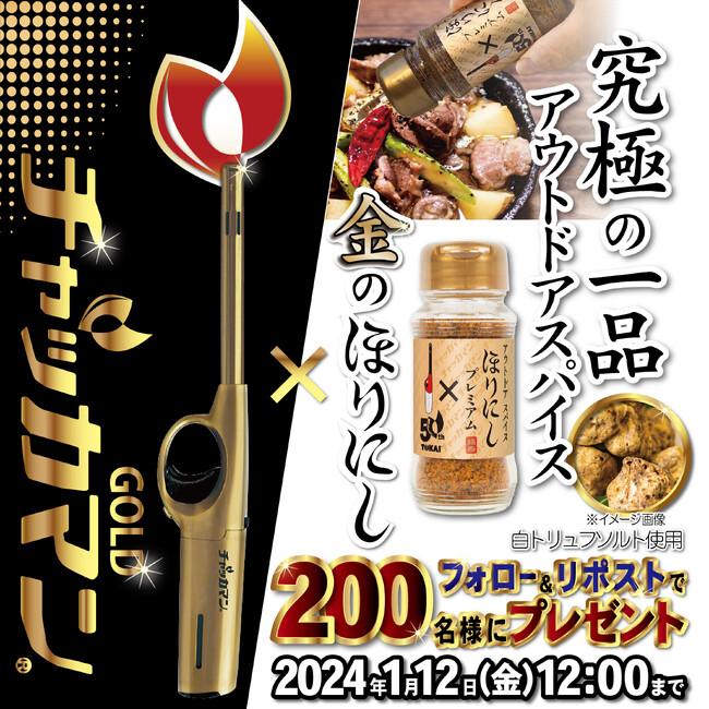 株式会社東海「本社:東京都新宿区 代表取締役:フェリックス・ホン(※以下東海)」は自社の50周年を記念して、3弾連続 X(旧Twitter)キャンペーンを実施中。第2弾は光り輝く金の多目的ライター【チャッカマンゴールド】とキャンプやBBQで大人気のアウトドアスパイスほりにし(※以下ほりにし)を販売するアウトドアショップOrange(※以下Orange)とタイアップし、アウトドアスパイスほりにしプレミアム【金のほりにし】にチャッカマンのロゴとイラストが入ったオリジナルラベル品をセットにして200名様にプレゼントする。「チャッカマン」のファンも「ほりにし」のファンも急いでXキャンペーンに応募しよう!!期間:2023年12月18日(月)~2024年1月12日(金)景品:【チャッカマンゴールド×1本】と【金のほりにしチャッカマンコラボデザイン×1個】のセット当選者数:200名様応募方法:@chakkaman_jpのXアカウントのフォロー&対象ポストのリポスト